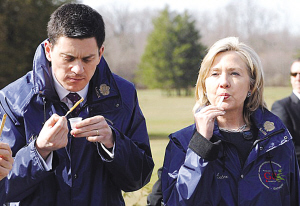 据英国媒体3月31日报道,此次的G8外长会议,各位外长们穿上了尼龙质地的蓝色滑雪衫,平常严谨有余、活泼不足的各位外长甚至还在镜头前“放肆地”大嚼加拿大特产的枫汁太妃糖。不过,最受媒体关注的还是美国国务卿希拉里和英国帅哥外交大臣米利班德。当天,他们在镜头前也丝毫没有半点避嫌的意思。两人全然不顾及自己的形象,一边嚼着太妃糖,一边与对方有说有笑。为此,英国媒体调侃两人为“外交伉俪”,并特意分别为两人取名为“小希”和“小米”。