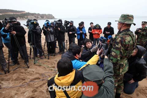 1日上午,韩国海军陆战队大队长在仁川瓮津郡白翎岛长村浦口海岸边向记者介绍搜救工作的进展状况。