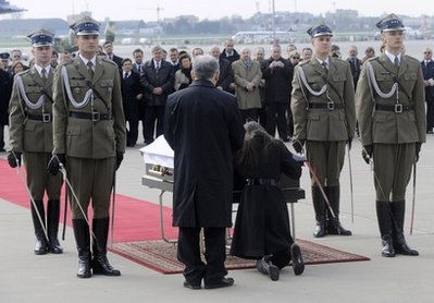 卡钦斯基的灵柩11日由一架波军直升机从撞机地点俄罗斯斯摩棱斯克运返波兰首都华沙,代理总统科莫罗夫斯基、总理图斯克等官员在场迎接,以一场简短的宗教仪式向其致祭。灵柩将会由军队护送到总统府,稍后,当局将会把总统府开放,让民众进入瞻仰卡钦斯基的遗容。