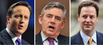 英国三大政党党首:保守党卡梅伦、工党布朗、自民党克莱格(从左到右)