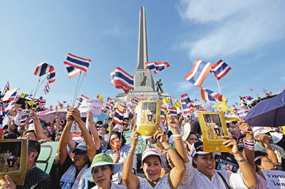 黄衫军示威者聚集在曼谷英雄纪念碑,挥国旗及泰王海报。