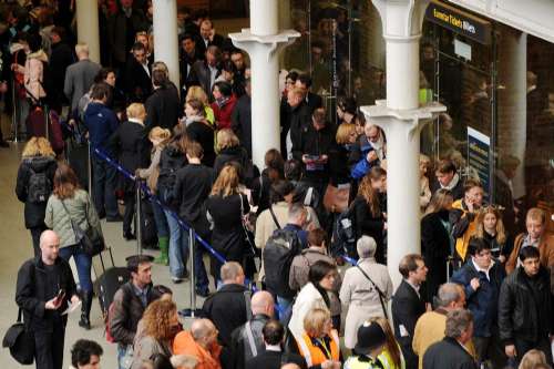 旅客们在伦敦排队等候购买欧洲之星的车票。