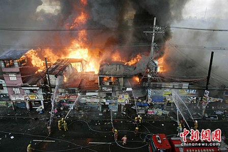 据台湾“中广新闻网”报道,菲律宾首都马尼拉郊区奎松市的一座贫民窟25日下午惨遭火灾肆虐,大火一发不可收拾,数百栋房屋付之一炬,上万人无家可归。
