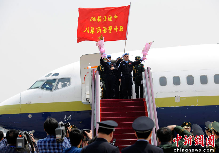 5月4日,中国第八支赴海地维和警察防暴队全体队员乘坐联合国包机返回祖国。公安部副部长孟宏伟、政治部主任蔡安季前往机场迎接。 中新社发 刘震 摄