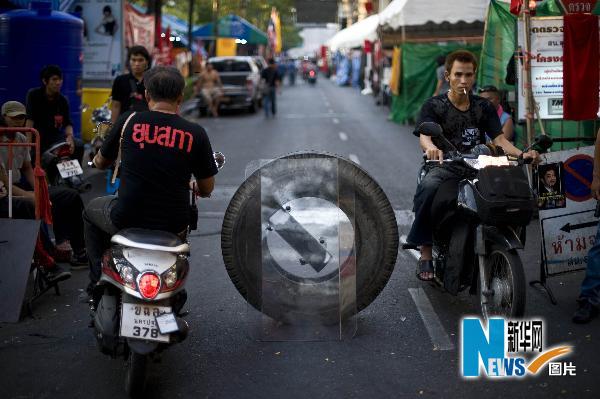 4月29日,当地男子骑摩托车出入位于泰国首都曼谷市中心的红衫军宿营地点。泰国总理阿披实4月30日说,政府将采取更加严厉的措施,阻止“红衫军”随意出入集会地点曼谷市中心拉差巴颂路口。新华社/法新