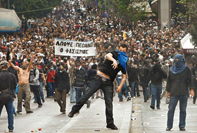 希腊5日爆发全国性罢工及10万人大示威,抗议政府的财政紧缩政策。据香港《文汇报》报道,在首都雅典约60人试图冲破警方的封锁线冲击国会,警方挥动警棍还击,又施放催泪气体。有银行遭投掷燃烧弹放火焚烧,最少3名职员死亡,5人受伤送院,消防员疏散约20人。警方总动员应付局面,并宣布首都进入戒备状态。