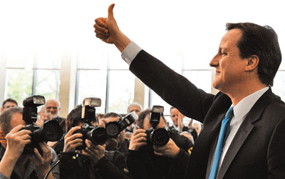 保守党支持率领先,党魁卡梅伦展示胜利手势。