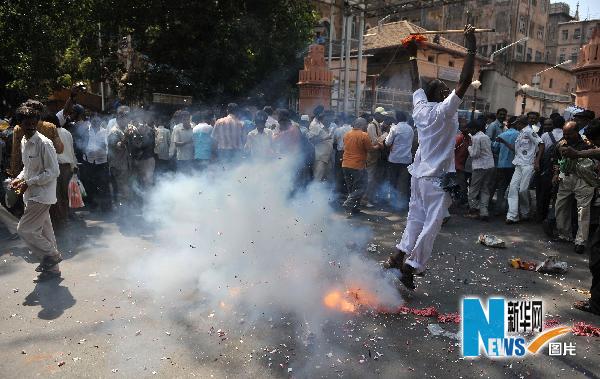 5月6日,人们在曾经发生恐怖袭击的印度孟买CST火车站外燃放鞭炮,庆祝袭击案罪犯卡萨布被判死刑。新华社/法新