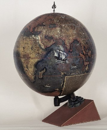 这是已知最早的中国地球仪,融合了东西方文化,于1623年专为当时中国皇帝制作。它的制作人据说是耶稣传教士曼纽尔·迪亚士(Manuel Dias)和龙华民(Nicolo Longobardi)。这两位都是令人敬仰的学者。该地球仪中的非洲和欧洲海岸绘图可能与当时中国传统地图有很大的差异。因为当时中国传统地图往往夸大了中国的面积,并且将中国的位置摆放在世界的中心。