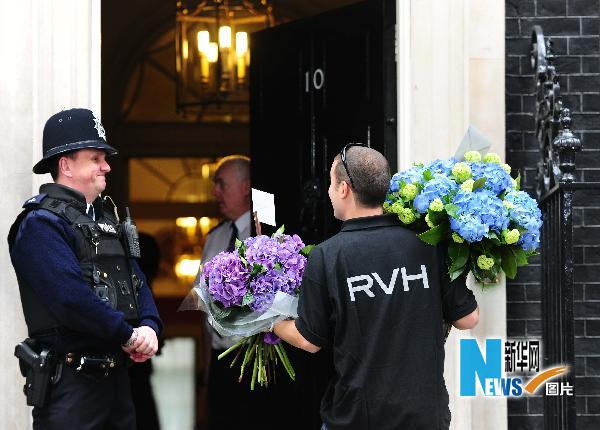 5月12日,在英国首都伦敦,一名送花的男子准备进入首相官邸唐宁街10号。唐宁街10号5月11日迎来英国新首相、保守党领袖卡梅伦。新华社记者曾毅摄