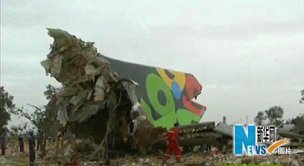 这张利比亚国家电视台5月12日的电视照片显示,利比亚非洲航空公司的一架客运班机坠毁在黎波里机场附近。 利比亚非洲航空公司12日说,当天早晨6时左右,8U771航班班机由南非约翰内斯堡飞抵的黎波里,在试图降落的过程中突然坠毁。据报道机上有93名乘客和11名机组人员。新华社/法新