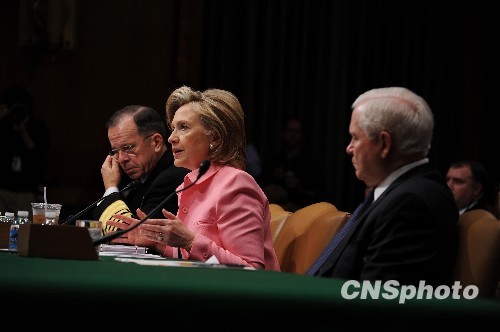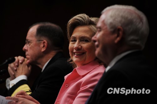 美国参议院外交委员会18日就新的美俄核裁军条约举行听证会。希拉里在听证会上表示,美国、中国和俄罗斯已经就制裁伊朗的联合国决议草案达成一致。图为美国国务卿希拉里(中)、国防部长盖茨(右)和美军参谋长联席会议主席迈克·马伦(左)到场作证。 中新社发 吴庆才 摄