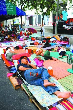 18日,在泰国首都曼谷,“红衫军”成员在聚集区午休。