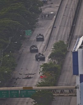 军方扩大了对红衫军聚集区的封锁范围,并使用扩音器呼吁在这一区域内的所有人返家。昨晚有传闻军方将展开清场行动,今晨仍能听到零星枪声。