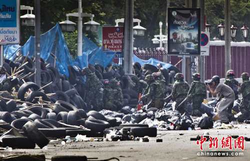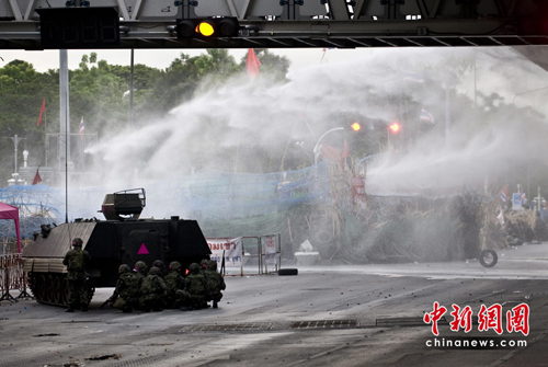 据报道,泰国军方的装甲车突破了一处红衫军示威地点的路障,进入示威者大本营,军方向示威者发射催泪瓦斯及开枪,还出动至少2架直升机协助驱散行动。另外,军队设立检查站封锁了一些路段,禁止车辆通行。