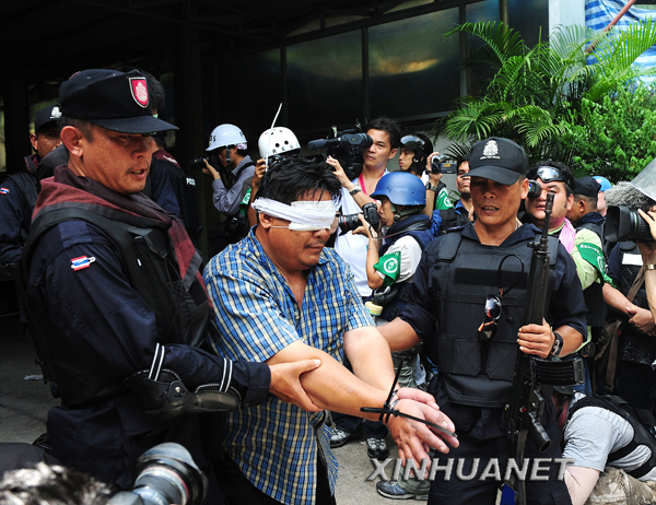 5月19日,在泰国首都曼谷,警察将在军队清场行动中逮捕的一名“红衫军”成员带走。当天凌晨,泰国军队对位于曼谷市中心商业区的“红衫军”示威者发起清场行动,“红衫军”领导人宣布停止在曼谷为期两个多月的集会并向警方自首。泰国政府紧急状态公共管理中心发言人当天发表电视讲话说,目前曼谷的局势已经在军方控制下。新华社记者陈铎摄
