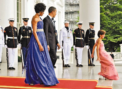 据香港《文汇报》报道,美国总统奥巴马19日在白宫设宴款待来访的墨西哥总统时发生一段小插曲,白宫的礼仪官准备迎接贵宾时,忽然跌一跤,整个人坐在阶梯上,受惊的她立刻站起来,开玩笑警告摄影记者不要拍照。