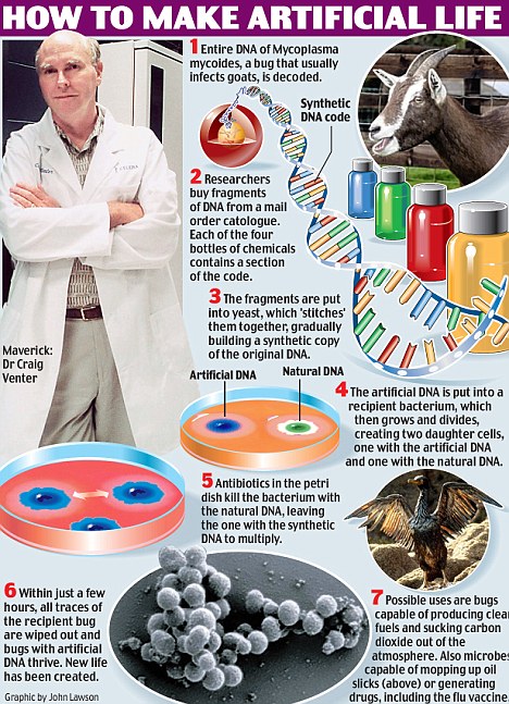 美国J·克雷格·文特尔研究所的研究人员在最新一期美国《科学》杂志上报告说,他们人工合成了一种名为蕈状支原体的细菌的脱氧核糖核酸(DNA),并将其植入另一个内部被掏空的、名为山羊支原体的细菌体内。经过多次失败的尝试后,最终他们使植入人造DNA的细菌重新获得生命,并开始在实验室的培养皿中繁殖。