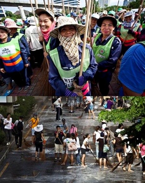 在网上发起年轻人前来清洗的一名前航空公司官员说,“在危机面前,我没法坐视不管。我上网发信息,邀约大家来清扫街道”。“我决定每周末都出去清理曼谷市容,直到曼谷恢复原样”。