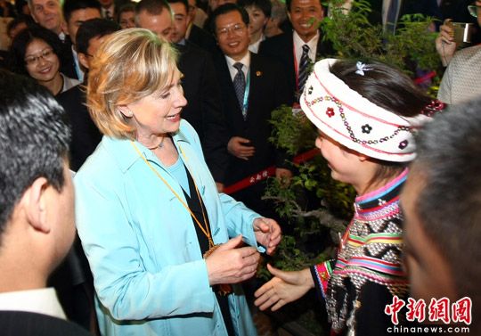 5月22日,美国国务卿希拉里·克林顿参观上海世博会中国馆,与云南馆少数民族演员交流。