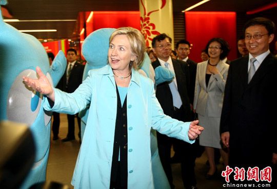 5月22日,美国国务卿希拉里·克林顿参观上海世博会中国馆,与吉祥物“海宝”互动。