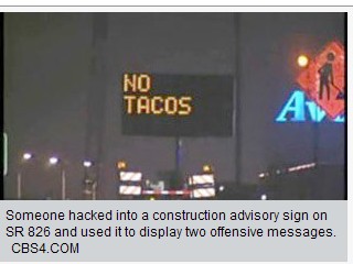 迈阿密一条公路的电子广告牌遭黑客入侵,出现“不要玉米饼”(NO TACOS)的字样。