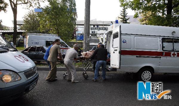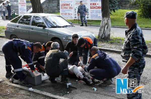 5月26日,救援人员在俄罗斯南部城市斯塔夫罗波尔的爆炸现场救助伤员。当日,斯塔夫罗波尔市中心发生爆炸事件,共造成6人死亡,约40人不同程度受伤。斯塔夫罗波尔护法机关的一名知情人士说,是一辆汽车发生了爆炸,不排除是一次恐怖袭击。新华社/法新