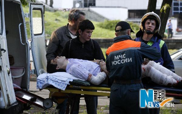 5月26日,救援人员在俄罗斯南部城市斯塔夫罗波尔的爆炸现场救助伤员。新华社/法新