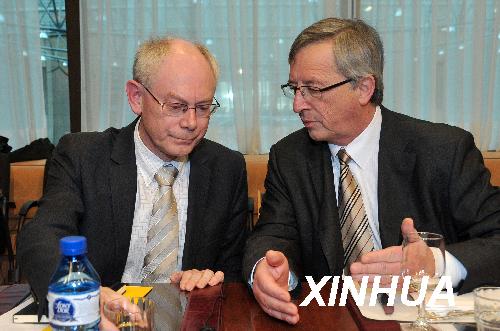 2010年3月15日,在比利时首都布鲁塞尔的欧盟总部,欧元集团主席、卢森堡首相容克(右)与欧洲理事会常任主席范龙佩在欧元区财长会议上交谈。当天,欧元区16国财政部长在布鲁塞尔举行会议,希腊债务危机成为会议的主要议题。新华社记者武巍摄