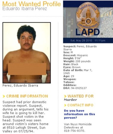 除了用模糊手段遮掩佩雷斯的“巨乳”,照片附上的嫌犯资料还显示,佩雷斯没有纹身和怪异的嗜好,而出生于1965年,年龄却显示为29则让他的真实年龄扑朔迷离。资料还警告称“不要接近佩雷斯,因为他身藏武器并十分危险”。