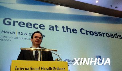 2010年3月23日,希腊财政部长乔治·帕帕康斯坦季努在雅典举行的“希腊在十字路口上”经济研讨会上发言。新华社发 马里奥斯·罗洛斯摄 资料图片