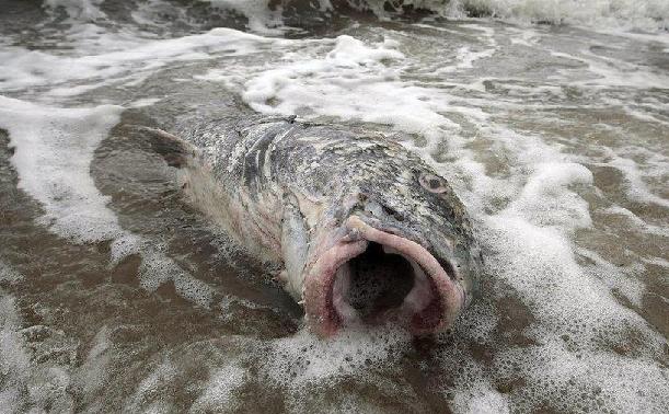 2010年5月2日,美国,帕司克里斯全:海滩上一条死去的鱼。