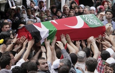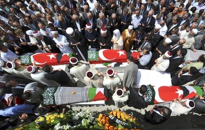 周四(3日),九名死者的尸体被从以色列运回土耳其。450多名活动人士也一同抵达,他们受到英雄般的欢迎。九名死者都是土耳其人或出生在土耳其,他们的棺材上覆盖着土耳其和巴勒斯坦的国旗。