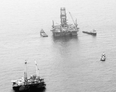从美国海岸警卫队的“海洋哨兵”巡逻机尾舱往下看,墨西哥湾大片大片的浮油随着波浪起伏,在阳光下折射出奇异的色彩。一艘艘船只拖着浮标在搜集海面油污。飞临漏油“原点”海面,可以看到一个巨大的海上作业平台,它仍在抽取水下漏油。(见上图,本报记者管克江摄)