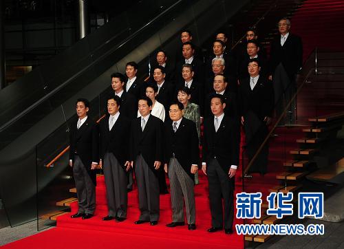 6月8日,在东京首相官邸,新任日本首相菅直人(前中)率内阁成员在媒体前集体亮相。当日,日本新当选首相菅直人组建新一届内阁。新华社记者 季春鹏摄