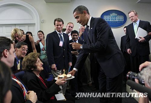 2009年8月4日,在华盛顿白宫,美国总统奥巴马向白宫专栏作家海伦·托马斯赠送蛋糕,庆祝海伦89岁生日。新华社/路透