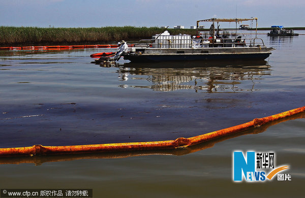 资料图片:6月1日,美国路易斯安那州威尼斯附近,工作人员在沼泽地里清理浮油。此前白宫官员称,墨西哥湾的大规模石油泄漏事件已成为美国迄今为止所面临的最大环境灾难。