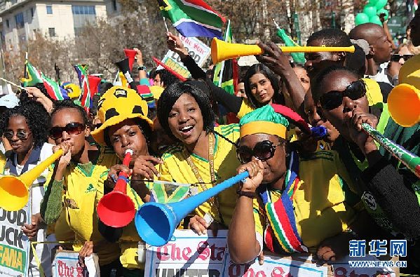 6月9日,热情的球迷。当日,数万民众在南非约翰内斯堡为南非国家足球队征战2010年世界杯举行声势浩大的声援活动。民众期望南非国家足球队能在世界杯比赛中取得优异的成绩。新华社发(梁铨摄)
