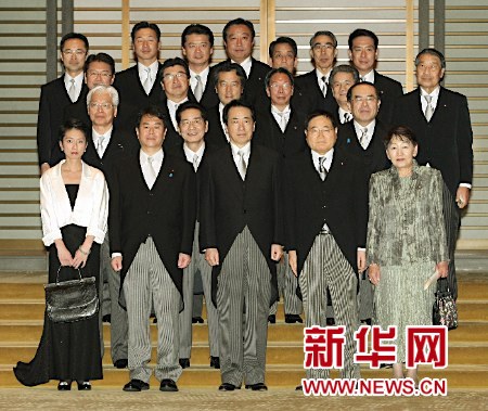6月8日晚,日本天皇在天皇宫中举行仪式,任命菅直人担任日本新首相,同时一一任命了其它17名大臣。图为菅直人率阁员合影。