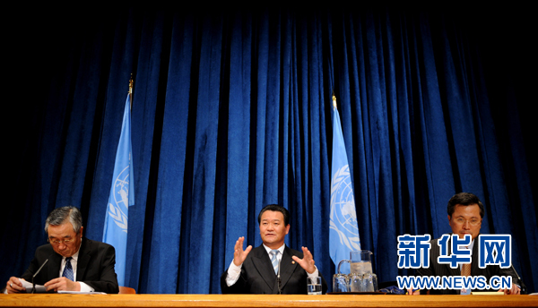 6月15日,在美国纽约联合国总部,朝鲜常驻联合国代表申善昊(中)回答记者提问。申善昊在当日的记者会上说,韩国公布的所谓“天安”号沉没事件调查结果“纯属伪造”。新华社记者申宏摄
