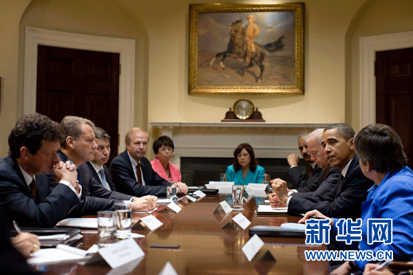 6月16日,在美国首都华盛顿白宫,美国总统奥巴马(右二)会见英国石油公司高层。英国石油公司当天表示,将拿出200亿美元建立墨西哥湾石油泄漏事件赔偿基金。新华社发(白宫新闻处)