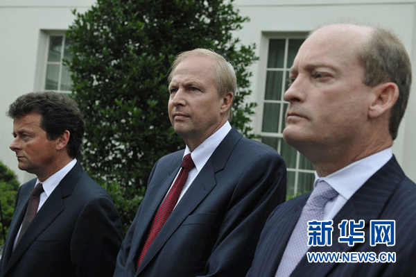 6月16日,在美国首都华盛顿白宫,英国石油公司首席执行官托尼·海沃德(左)、总经理罗伯特·达德利(中)和英国石油公司美国分公司总裁拉马尔·麦凯与媒体见面。新华社记者张军摄