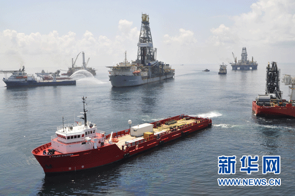 这张摄于6月15日的照片显示,船只在墨西哥湾“深水地平线”钻井平台泄漏现场清理原油。英国石油公司16日表示,将拿出200亿美元建立墨西哥湾石油泄漏事件赔偿基金。新华社发(美国海岸警卫队/鲍勃·劳拉摄)