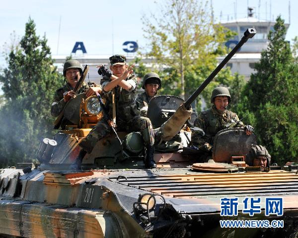 6月14日,士兵在吉尔吉斯斯坦南部城市奥什机场附近巡逻。 新华社/法新