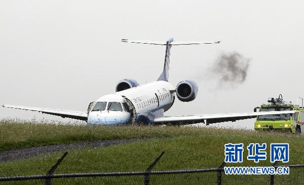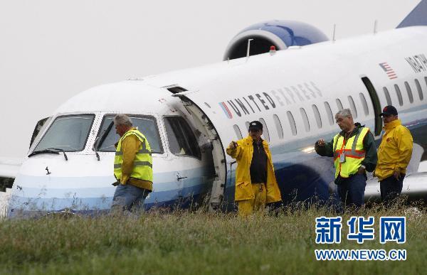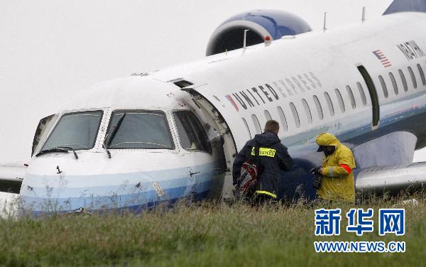 6月16日,工作人员在加拿大渥太华国际机场检查滑出跑道的美联航飞机。机场新闻发言人当天说,这架由巴西航空工业公司制造的飞机从美国华盛顿飞抵渥太华时滑出跑道,但没有造成人员死亡或重伤。 新华社/路透