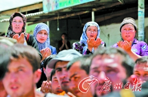19日在奥什街头,一群乌兹别克族妇女在祈求和平。
