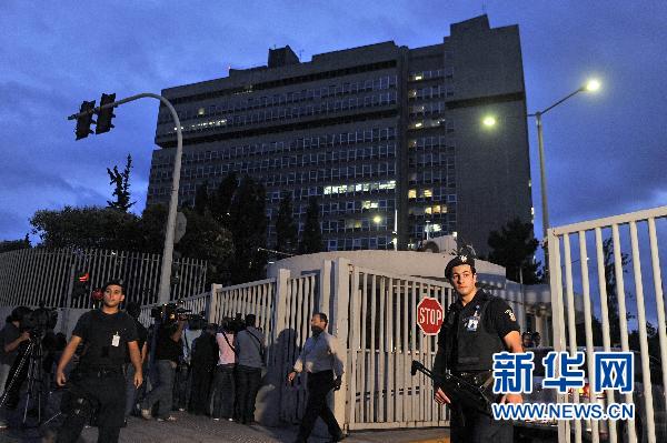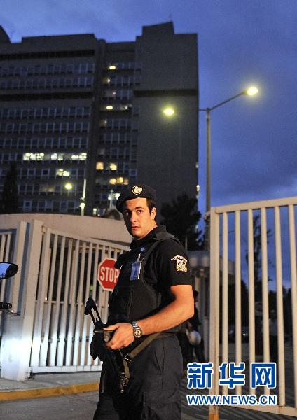 6月24日,警察在希腊首都雅典的希腊公民保护部大楼外警戒。希腊公民保护部大楼当日傍晚发生爆炸,造成1人死亡。 新华社/法新