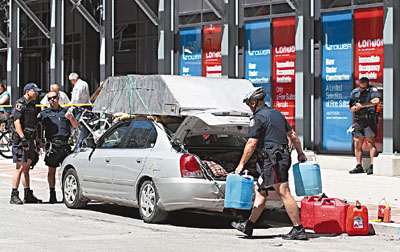 据香港《文汇报》26日报道,G20峰会前夕,各成员国领袖陆续抵?,加拿大警方在多伦多市采取极严密保安措施。连日来已有3名可疑人士被捕,其中1名53岁男子前日驾车经过峰会会场禁区,由于车顶绑着1个钢制储物箱,模样怪异,引起警方注意。警察拦车检查,赫然发现车上有十字弓、电锯、棒球棍、大锤外,还有多种不明液体。警方没收这批物品,并将他拘捕。