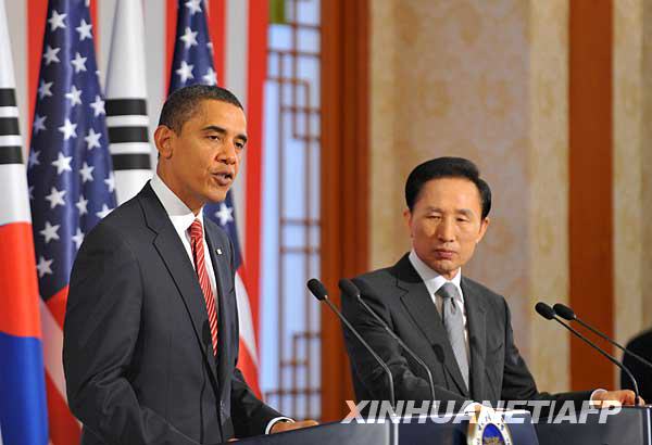 资料图片:2009年11月19日,在位于韩国首都首尔的总统府青瓦台,美国总统奥巴马(左)在记者招待会上发言。新华社/法新