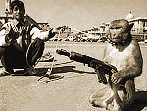 据英国媒体27日报道,阿富汗的塔利班军阀们竟想出了一种匪夷所思的方法来对付驻阿盟军:他们竟将一些爱吃香蕉和花生的猴子训练成了“致命杀手”,教会了这些猴子如何使用卡拉什尼科夫冲锋枪、布伦式轻机枪甚至迫击炮,并教它们如何专门向穿美军服装的士兵发起袭击。颇具讽刺意味的是,“训练猴子当杀手”的主意最早却是由美国中情局发明出来的,美国中情局曾在越战中发起“香蕉行动”,专门用花生和香蕉当奖品,训练一些“猴子士兵”在丛林中猎杀越南士兵。